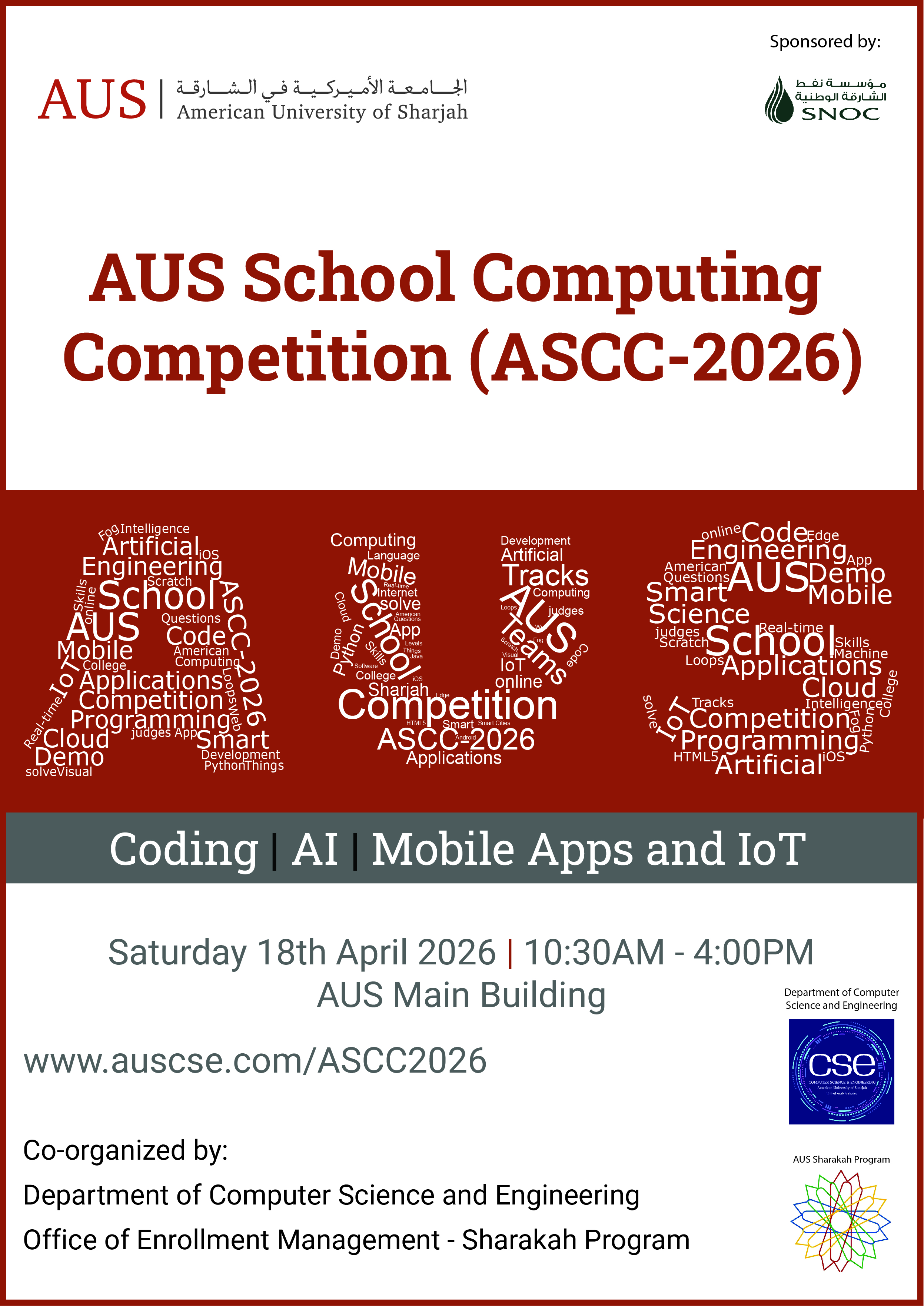 • 2025 AUS School Computing Competition (ASCC-2025) • 2024 AUS School Computing Competition (ASCC-2024) • 2023 AUS-emaratech School Computing Competition (AeSCC-2023) • 2022 AUS School Computing Competition (ASCC-2022) • 2021 AUS School Computing Competition (ASCC-2021) • 2019 AUS-emaratech School Computing Competition (AeSCC-2019) • 2018 AUS-du School Computing Competition (AdSCC-2018)