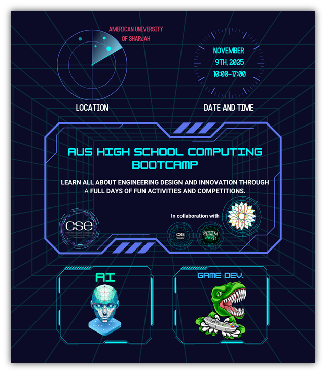 The AUS High School Computing Bootcamp is an educational and entertaining events targeted at students between grades 10-12. During the bootcamp, students will engage in a series of experiments and hands-on activities, related to various topics in Computer Science and Engineering. Students will also explore new grounds of science, and develop essential skills necessary for their future University life.
